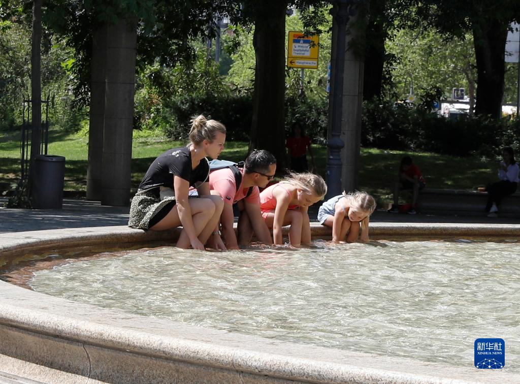 7月8日,人们在德国法兰克福的一处喷泉玩水。近日,德国法兰克福逐渐迎来暑热天气。新华社记者 张帆 摄