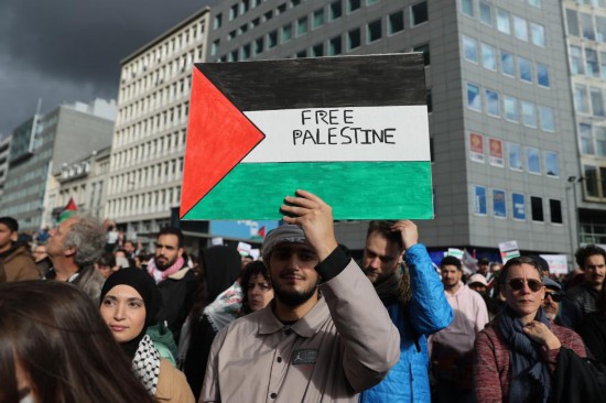2023年10月22日,示威者在比利时布鲁塞尔欧盟总部附近举行集会,声援巴勒斯坦。新华社记者赵丁喆摄