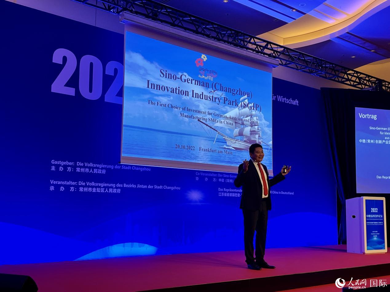 人民网法兰克福10月20日电 (记者张慧中)2022中德经济合作论坛暨中德(常州)创新产业园推介会20日在德国法兰克福举行。该活动由常州市人民政府主办,中德(常州)创新产业园、江苏省驻德国巴登—符腾堡州办事处协办,常州市金坛区人民政府承办。中国驻法兰克福总领馆经济商务领事朱伟革,常州市商务局副局长彭立,常州市金坛区委副书记、代区长胥亚伟,以及约150位来自德国、奥地利、瑞士的政府人士、企业界人士和学者,通过线上线下相结合的方式,共叙友情、共话合作、共谋发展,探讨中德两国投资合作的机遇与前景。