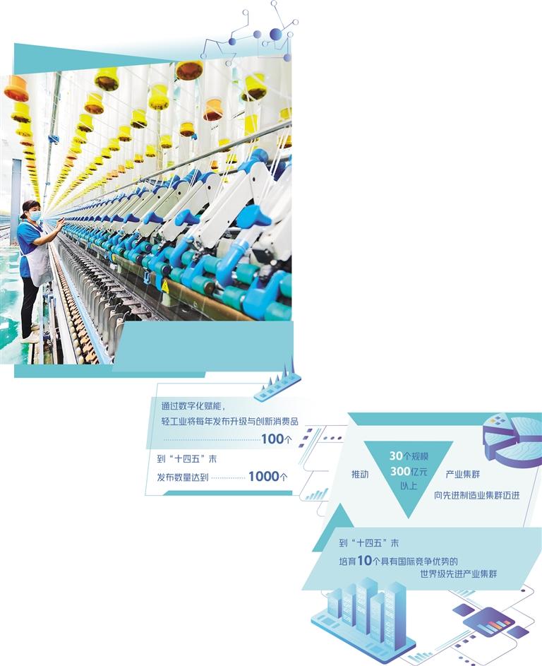 “轻工业将通过数字化赋能增品种、提品质、创品牌。”张崇和透露,将大力发展功能食品、婴童用品、智能家电、智慧家居、适老产品、绿色设计产品。每年发布升级与创新消费品100个,到“十四五”末,发布数量达到1000个。绿色设计产品总量达到2000个。同时,以数字化赋能产业集群转型,推动30个规模300亿元以上的产业集群率先向先进制造业集群迈进,形成超2万亿元规模的产业集群第一方阵。到“十四五”末,培育10个具有国际竞争优势的世界级先进产业集群。