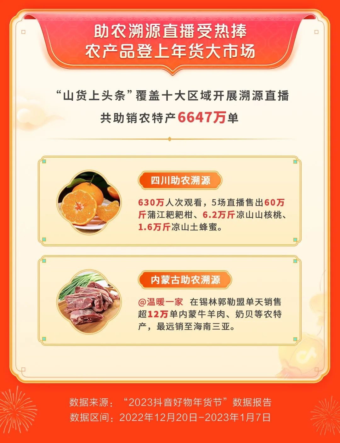 此外,平台提供了数百万元货品补贴,并联动更多电商优质达人带货,帮助不少地方风味拓展市场。去年12月20日至今年1月7日,1872万块陕西富平柿饼、15.8万斤贵州熏腊、85万块200g重的重庆火锅底料通过抖音电商销往各地。19天内,该平台售出的武鸣沃柑可以装满65万辆9.6米型号的卡车,卖出的福建地瓜干相当于消化了406亩地红薯。
