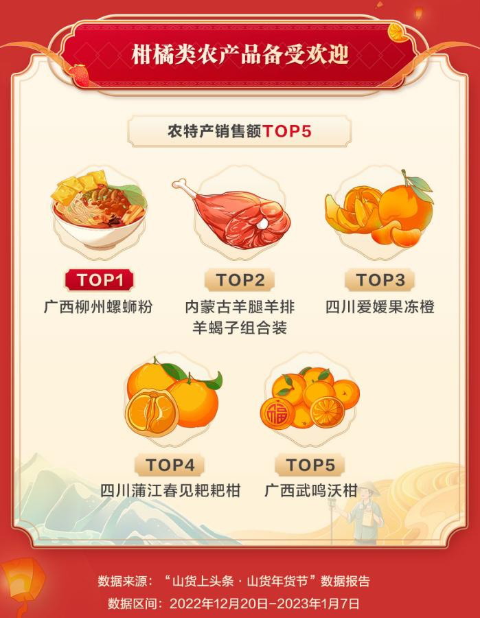 数据显示,在众多农特产中,广西柳州螺蛳粉、内蒙古羊腿羊排羊蝎子组合装、四川爱媛果冻橙、四川蒲江春见耙耙柑和广西武鸣沃柑颇受消费者欢迎,销售额居于前列。