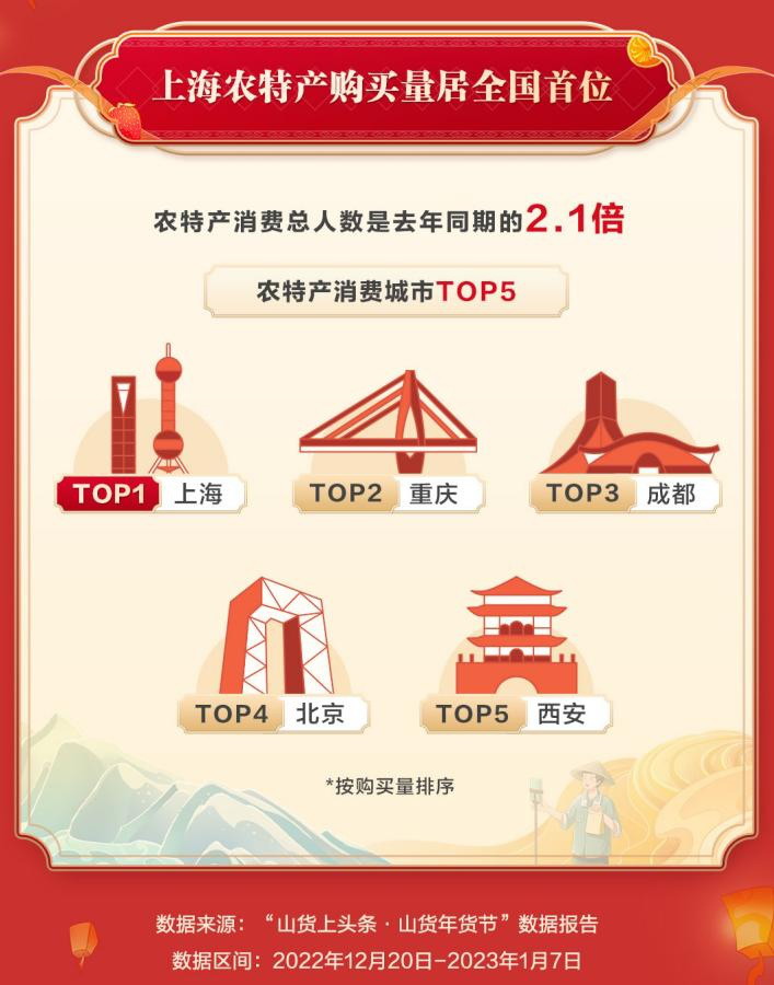 数据显示,来自上海、重庆和成都的消费者在“山货年货节”期间购买的农特产最多,北京和西安消费者紧随其后。