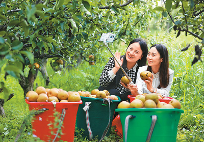 网红主播在贵州省黔西市金碧镇铧口寨社区梨子基地,帮助村民直播销售梨子。周训超摄(人民图片)