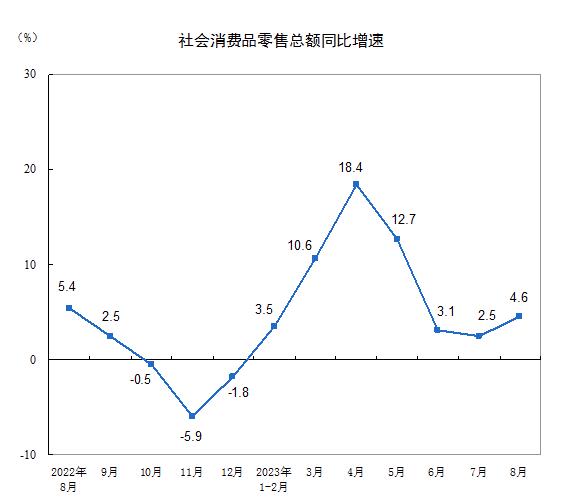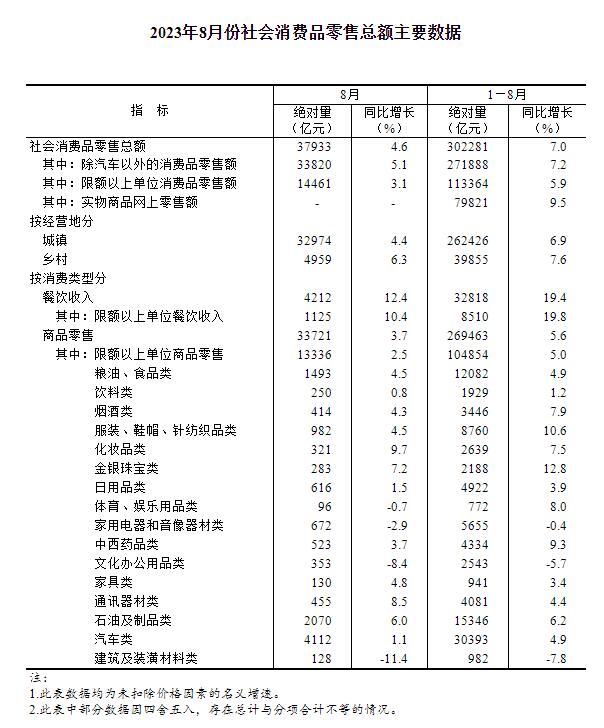 8月份,社会消费品零售总额37933亿元,同比增长4.6%。其中,除汽车以外的消费品零售额33820亿元,增长5.1%。