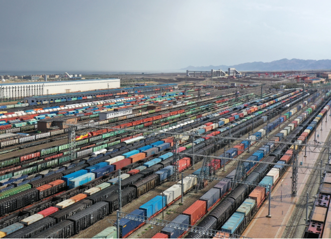 2023年9月1日,新疆博州,繁忙的阿拉山口站,站内中欧班列集结待发。