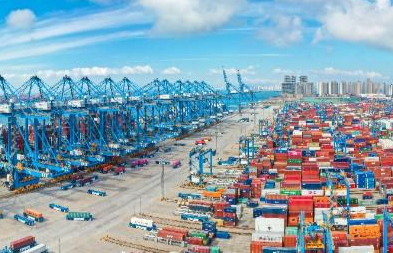 位于青岛自贸片区的青岛港前湾港区,巨型货轮往来穿梭,一片繁忙。