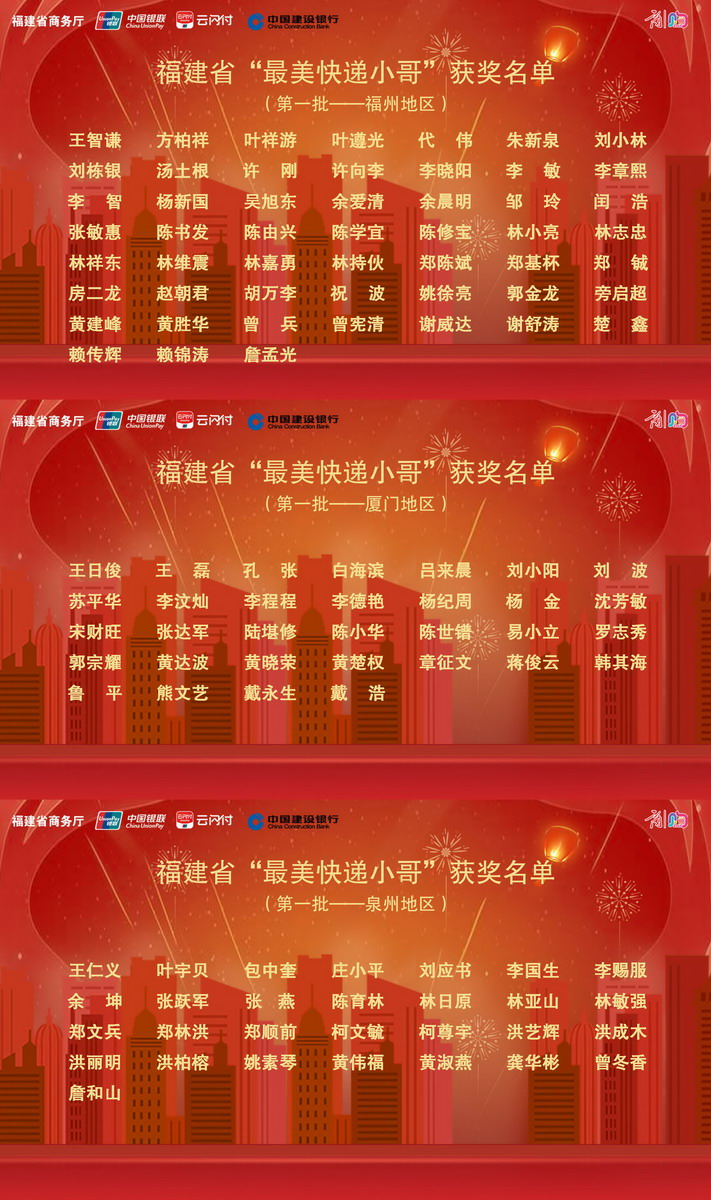 3月5日,福建省商务厅、中国银联福建分公司、中国建设银行福建省分行举办“最美快递小哥”颁奖仪式,向社会公布第一批“最美快递小哥”名单。省商务厅党组书记、厅长吴南翔,银联福建分公司、建行福建省分行以及省委网信办、团省委、省总工会领导出席活动,并向“最美快递小哥”代表授予荣誉证书。福州朴朴电子商务有限公司、永辉超市股份有限公司、阿里巴巴本地生活服务公司等企业代表发言,表示将积极响应倡议,加大对企业快递配送人员的关心关爱力度,全力配合推进“全闽乐购”福建促消费行动。获评“最美快递小哥”的福州朴朴电子商务有限公司林志忠、福建苏宁物流有限公司郑陈斌代表发言,介绍个人事迹。