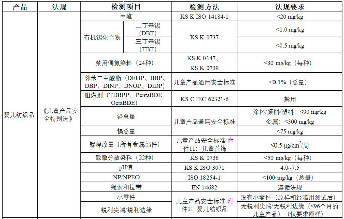 ④韩国《儿童用品通用安全标准制定和安全确认法 附录1:婴儿纺织品》