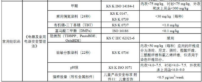 出口韩国纺织服装企业须关注婴儿纺织品和儿童纺织品的安全检查和安全确认标志,婴儿纺织品、儿童纺织产品和家用纺织品的限量指标和检测方法,特别是阻燃剂、有机锡、重金属、NP/NPEO、富马酸二甲酯、有害磁体、金属部件的镍释放等我国纺织服装强制性标准未进行规定的项目。