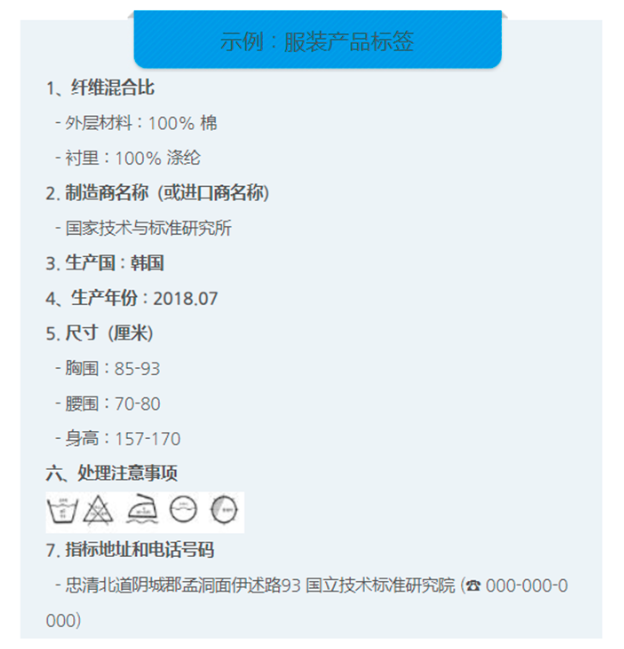 (2)符合安全标准的家用纺织品无须加贴KC标志,但应标明各项安全标准规定的标识事项。服装产品标签示例如下。