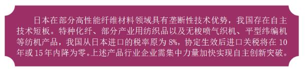 加大技术研发和标准化建设。企业应利用部分产品逐步降税的时间窗口,加快转型升级,提升技术水平,积极防范和化解日本化纤及纺织机械产品的降税冲击。相关龙头企业需与行业协会、政府主管部门共同努力,推动新型纺织纤维材料、功能性纺织品、智能纺织品、高技术产业用纺织品以及绿色制造、智能制造等重点领域的标准制定,加快产业高质量发展。