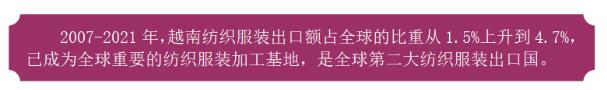 近年来,以越南为代表的东盟区域纺织服装产业发展迅速,与我国在合作中形成竞争的趋势明显。此外,受国内劳动力成本提高、中美贸易摩擦以及“新疆棉”等因素影响,部分国际订单已转向东盟国家,随着RCEP贸易投资规则的实施,纺织业向东盟国家转移可能进一步加速。