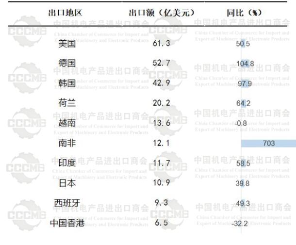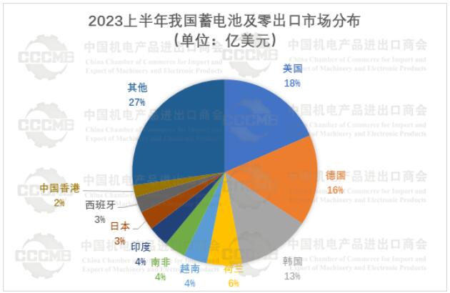 从出口市场来看,上半年,美国、德国、韩国、荷兰、越南、南非、印度、日本、西班牙、中国香港为我锂电池前十大出口目的地,占据我出口75.5%的全球市场份额。其中,对美出口61.3亿美元,较上年增长50.5%,占19.2%的市场份额,居第一位;对德国出口52.7亿美元,同比增长104.8%,占16.5%份额,列第二位;对韩出口42.9亿美元,同比增长约97.9%,占13.4%份额,位列第三。