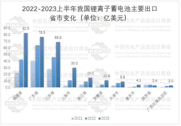 2023年上半年,福建、广东、江苏、上海、浙江、安徽、天津、重庆、陕西、广西是我国大陆锂离子蓄电池前十大出口地区,约占我锂电池行业整体出口的95%。其中,福建省出口额达82.5亿美元,同比增长96.9%,占25.8%,居第一位;广东省出口额76.5亿美元,同比增长19.5%,约占24%,列第二位;排名第三的是江苏省,出口68.9亿美元,同比增长50.1%,占21.6%。前三大出口地区所占份额高达71.4%,呈高度集中态势。