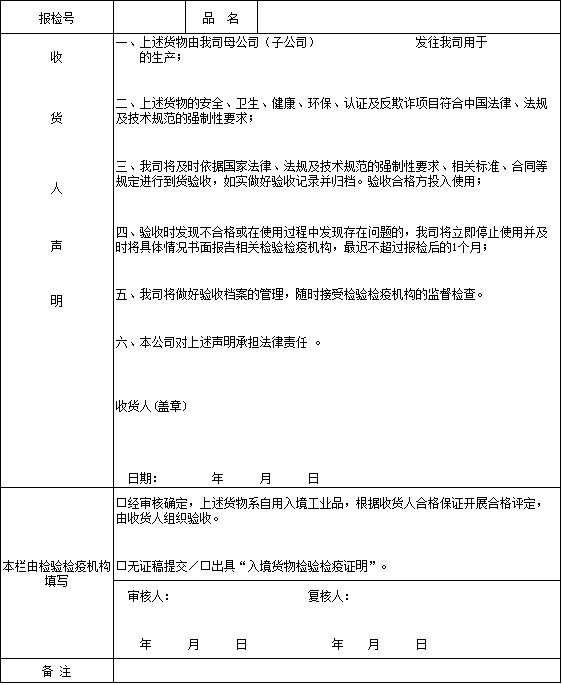 自用入境工业品收货人声明