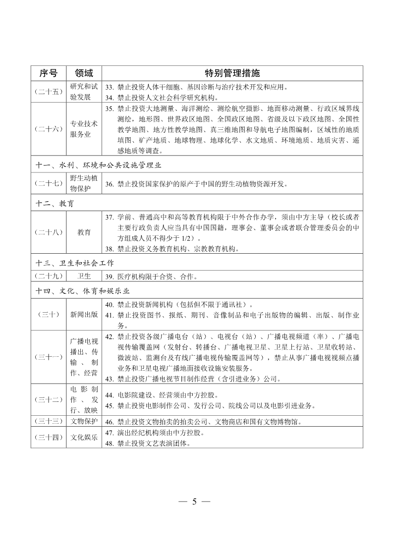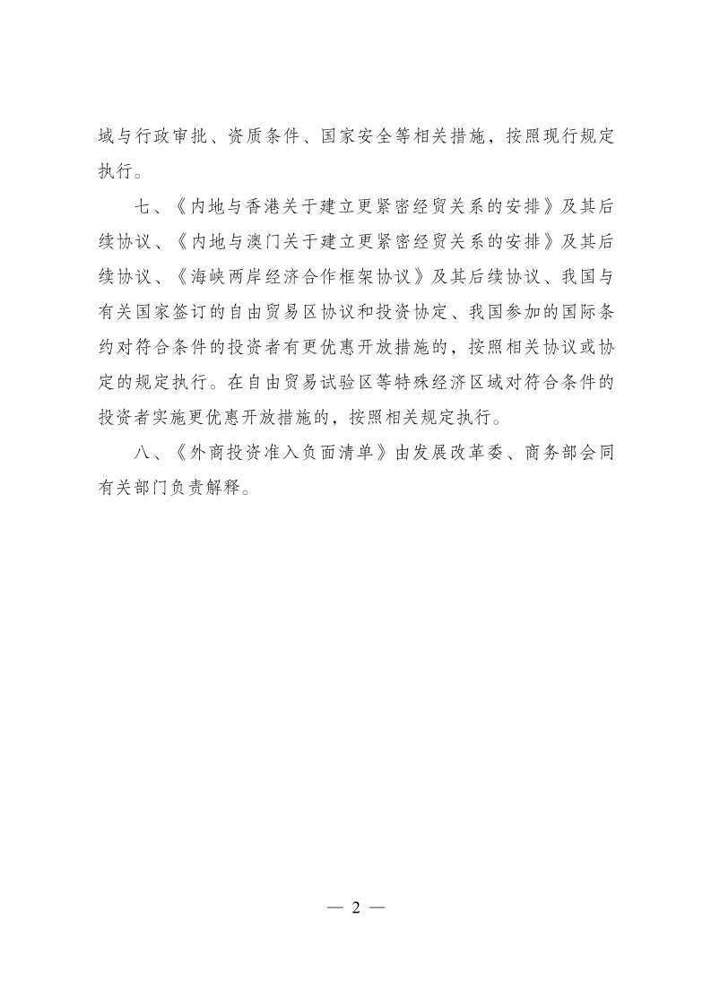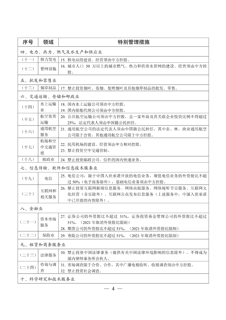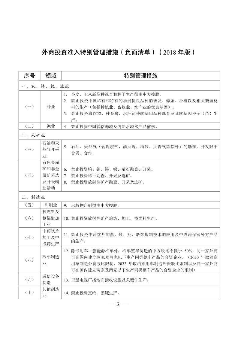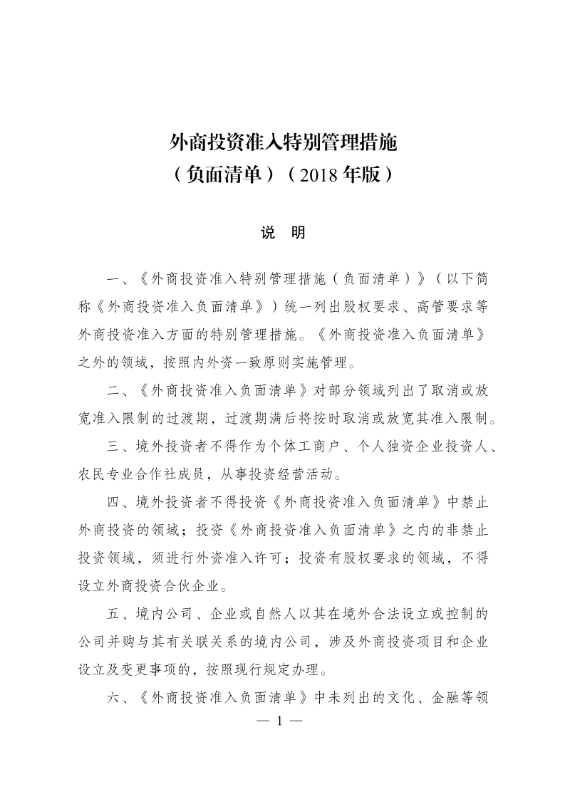 外商投资准入特别管理措施(负面清单)(2018年版)