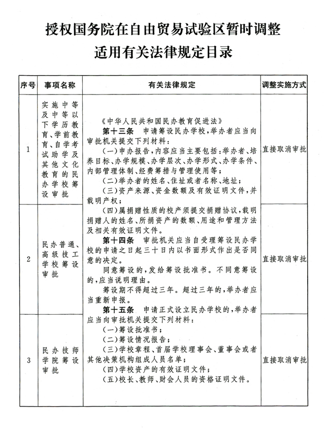 全国人民代表大会常务委员会关于授权国务院在自由贸易试验区暂时调整适用有关法律规定的决定
