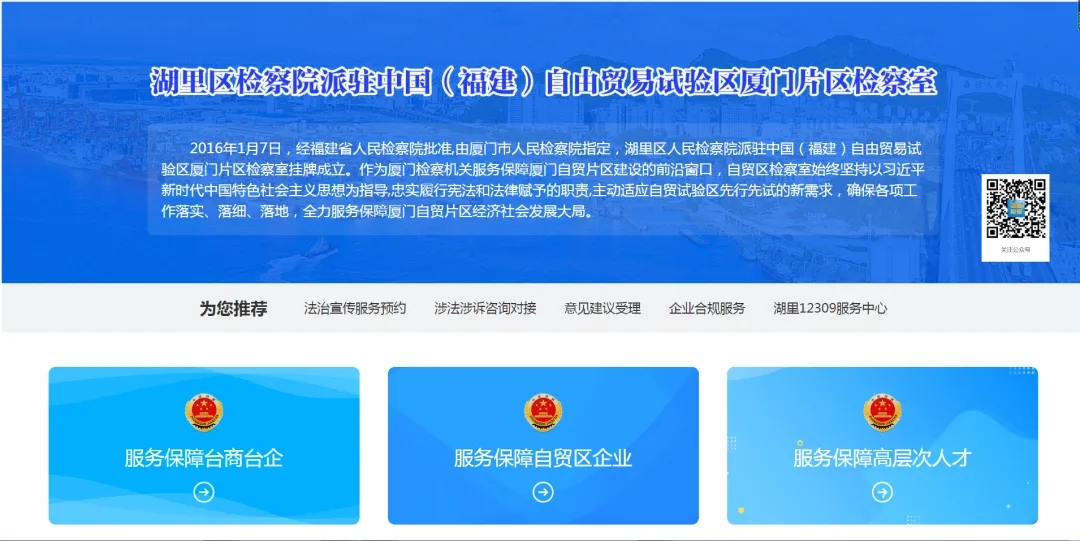 厦门市湖里区检察院立足派驻厦门自贸片区检察室贴近厦门自贸片区建设一线前沿、直接服务厦门自贸片区发展的工作实际,主动对接、融入“海丝中央法务区·云平台”建设,先行先试自贸检察网络服务等智慧法务新业态、新资源,开拓服务自贸片区建设检察网络新阵地、新平台。