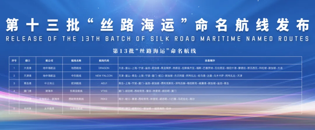 本次年会发布了第十三批“丝路海运”命名航线,涉及大连港、天津港、青岛港、厦门港、广州港、钦州港的6条集装箱班轮航线。至此,“丝路海运”命名航线达122条,通达46个国家和地区的135座港口。