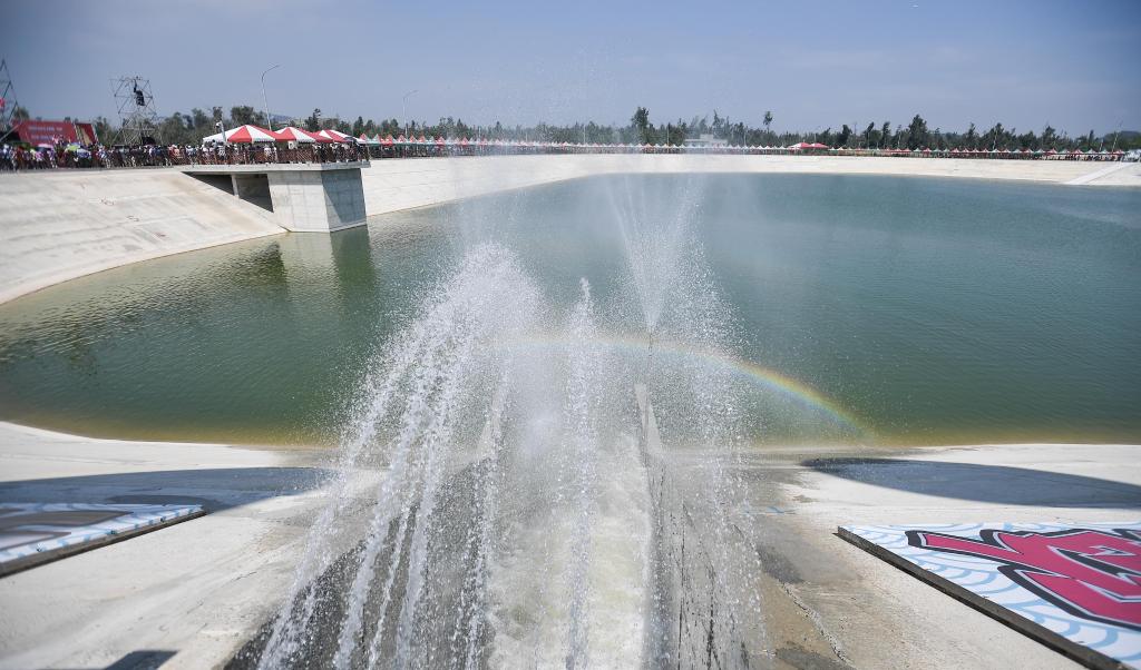 2018年8月5日,福建向金门供水工程实现正式通水,来自福建的清水流进金门田埔水库旁的受水池。新华社记者薛玉斌摄