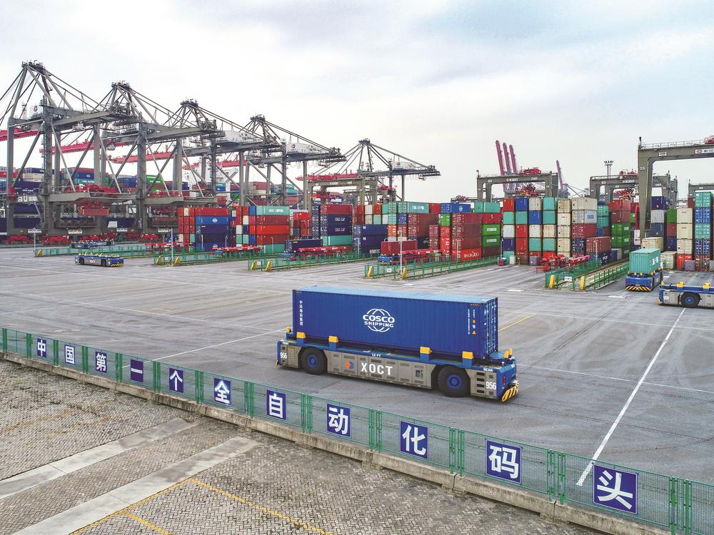 集装箱卡车前往堆场,远程操控轮胎吊,再抓起集装箱,堆叠成垛……