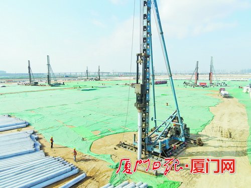 ▲厦门空港综合保税区(筹)首个开工项目——厦门航空产业启动区1月4日参加厦门市2022年新年开门红重大项目集中开工活动。该项目正在开展桩基施工,今年1月已完成投资5800万元(含地价)。(本报记者 杨进福 航拍器摄)