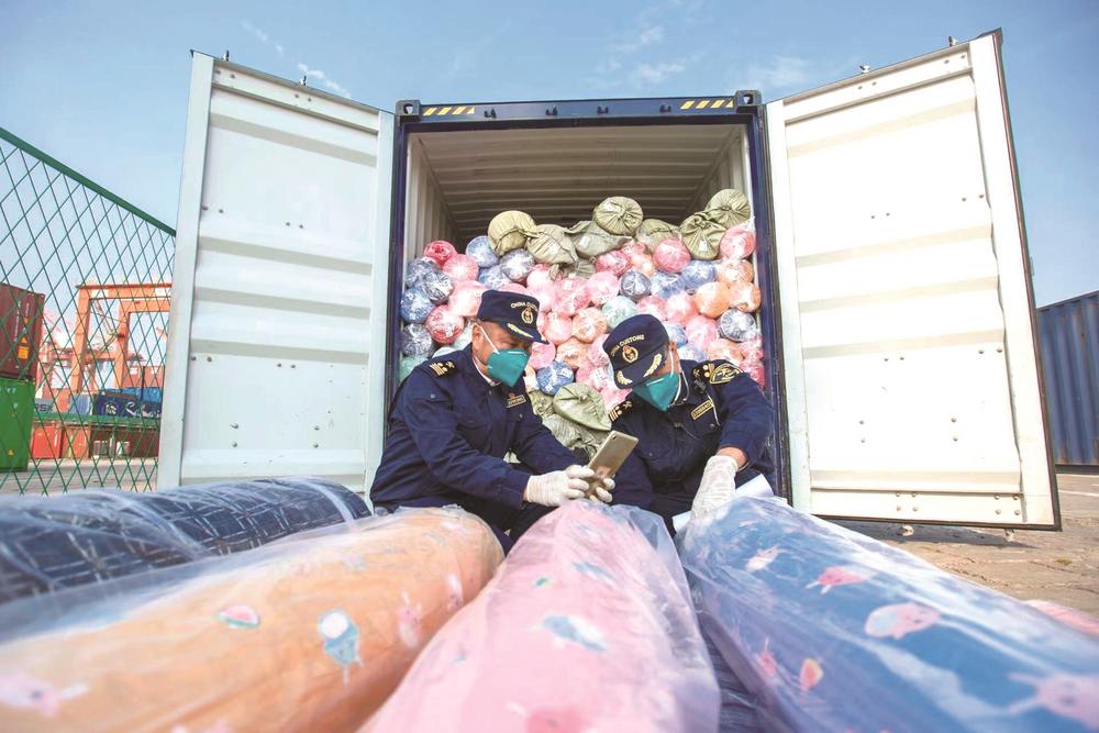 厦门海关关员正在对一批获得原材料RCEP原产地证书的出口纺织原材料进行监管。