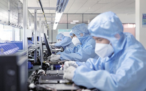 日前,中国(黑龙江)自由贸易试验区哈尔滨片区加大与数字经济头部企业合作,通过数字经济内部产业链划分,形成数字经济产业细分图谱,努力实现数字经济转型发展。图为哈尔滨海邻科信息技术有限公司生产车间内工作人员在进行生产作业。
