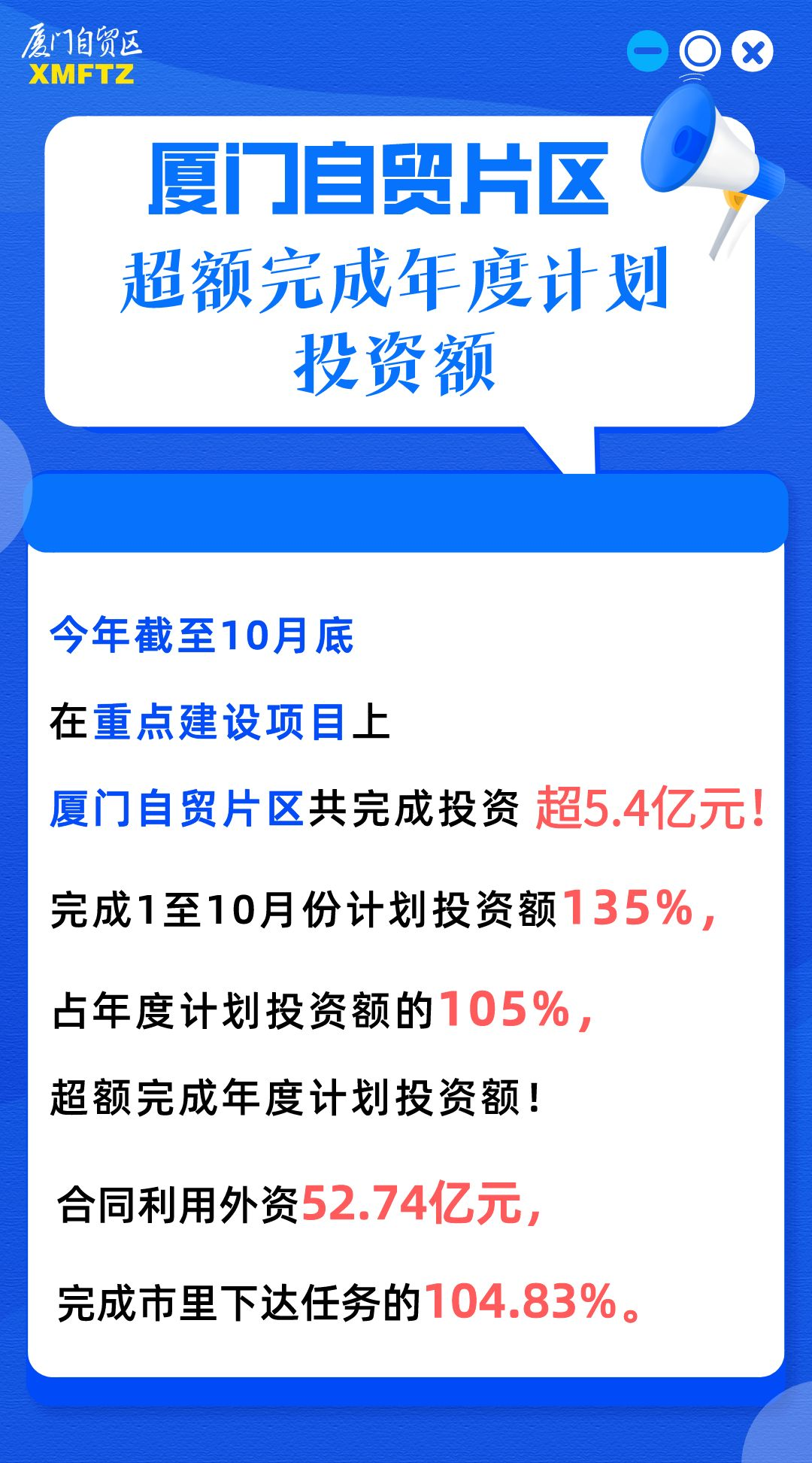 提高效率、提升效能、提增效益,大项目好项目是高质量发展的重要支撑。数据显示,截至今年10月底在重点建设项目上,厦门自贸片区超额完成年度计划投资额。