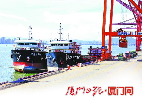 日前,在厦门港海天码头12号泊位上,一艘名为“海邦达318”的内支线集装箱船舶,并排靠泊在另一艘“海邦达328”轮外侧船舷,同时,岸边桥吊从“海邦达318”轮抓取集装箱,“跨船”卸载到码头拖车上。此举标志着厦门港首次开展船舶“双档靠泊”作业取得成功,进一步优化国际一流营商环境,提升东南国际航运中心软实力。