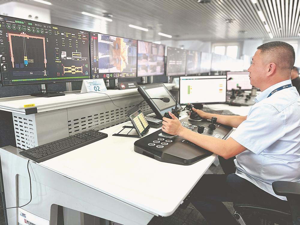 在远程控制室里,司机面对多个显示屏,熟练地通过操纵杆与按键掌控着码头龙门吊的移动与起降。