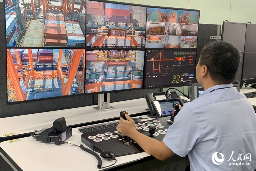 厦门国际航运科创中心内,技术人员正远程控制集装箱装卸作业。