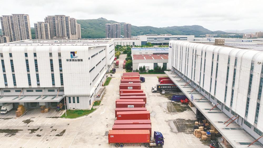 在岚台两岸跨境物流集散中心,货车正在装卸货物。