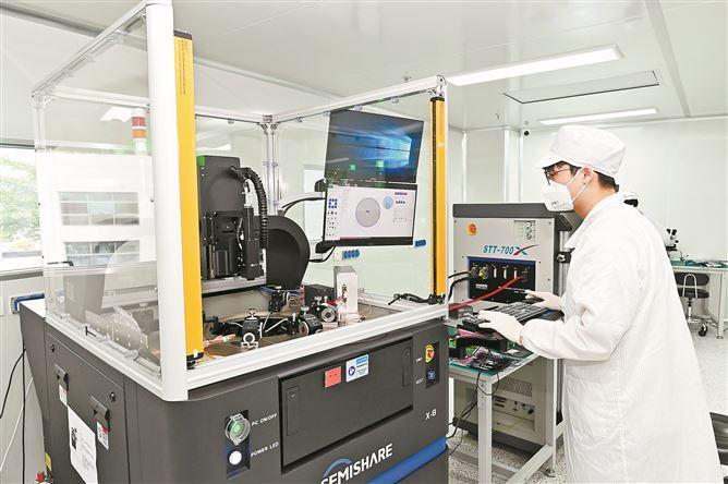 “这是我们刚刚建好的洁净实验室,用来进行集成电路中间测试,可以判断晶圆上芯片的性能。”芯一代总经理陈利介绍道,芯片很脆弱,一点点灰尘可能就会毁掉一颗芯片,因此整个测试过程必须在洁净实验室里进行,防止芯片被空气中的灰尘毁坏。