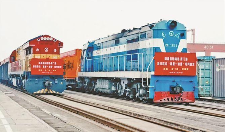 2024年12月12日上午,伴随着汽笛长鸣,两列海铁联运班列依次驶出南昌国际陆港,标志着南昌国际陆港至厦门港海铁联运“昌厦一港通”班列正式开行。搭乘海铁联运班列的货物先到达厦门港区,再搭乘国际班轮驶往越南海防港和柬埔寨西哈努克港。