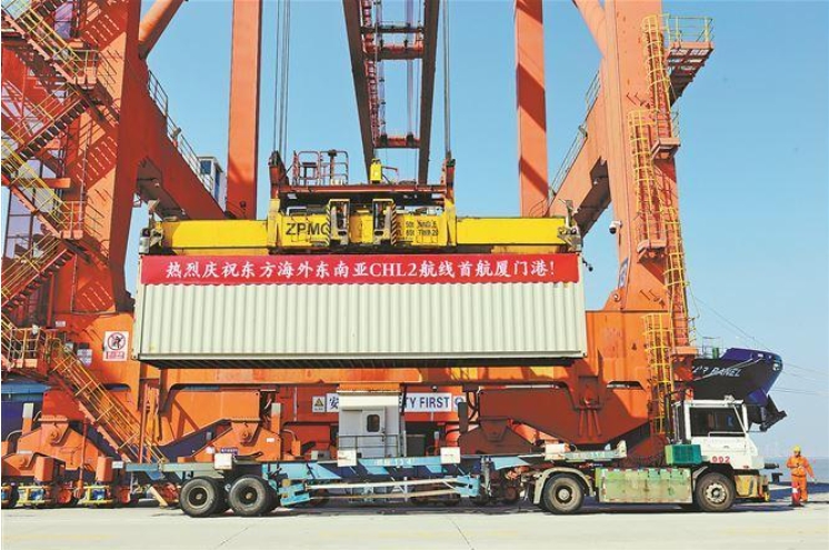 1月15日上午,厦门港迎来东南亚航线CHL2的首航,首航船“东方迪尔潘”号集装箱船舶满载着服装鞋帽、家具、化肥、汽车配件等货品,从海天码头远航东南亚。