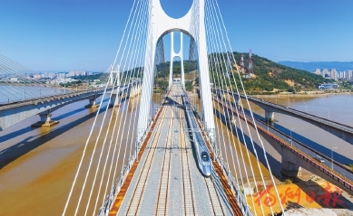 高铁列车组通过三江口大桥。本报记者 林双伟摄